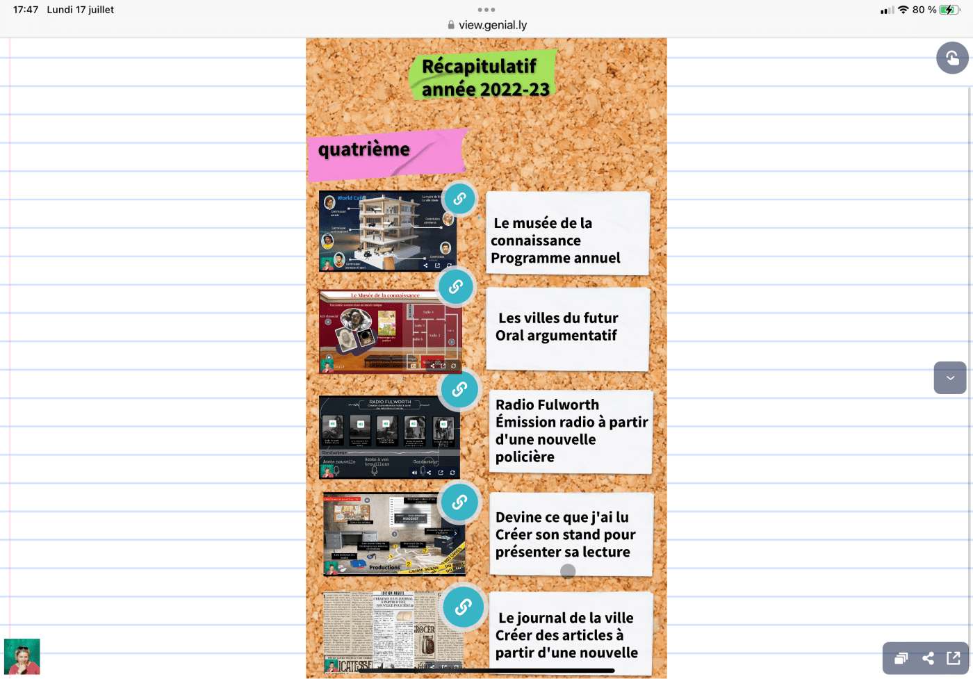 Récapitulatif 2022-23 En savoir plus sur Le Blog pédagogique de Marie Soulié Abonnez-vous pour recevoir les derniers articles par e-mail. Saisissez votre adresse e-mail… Abonnez-vous Partager : Cliquer pour partager sur X(ouvre dans une nouvelle fenêtre) X Cliquez pour partager sur Facebook(ouvre dans une nouvelle fenêtre) Facebook Cliquer pour envoyer un lien par e-mail à un ami(ouvre dans une nouvelle fenêtre) E-mail Cliquez pour partager sur LinkedIn(ouvre dans une nouvelle fenêtre) LinkedIn Cliquez pour partager sur WhatsApp(ouvre dans une nouvelle fenêtre) WhatsApp Cliquer pour partager sur Bluesky(ouvre dans une nouvelle fenêtre) Bluesky J’aime chargement… Similaire Laisser un commentaire Annuler la réponse. Δ