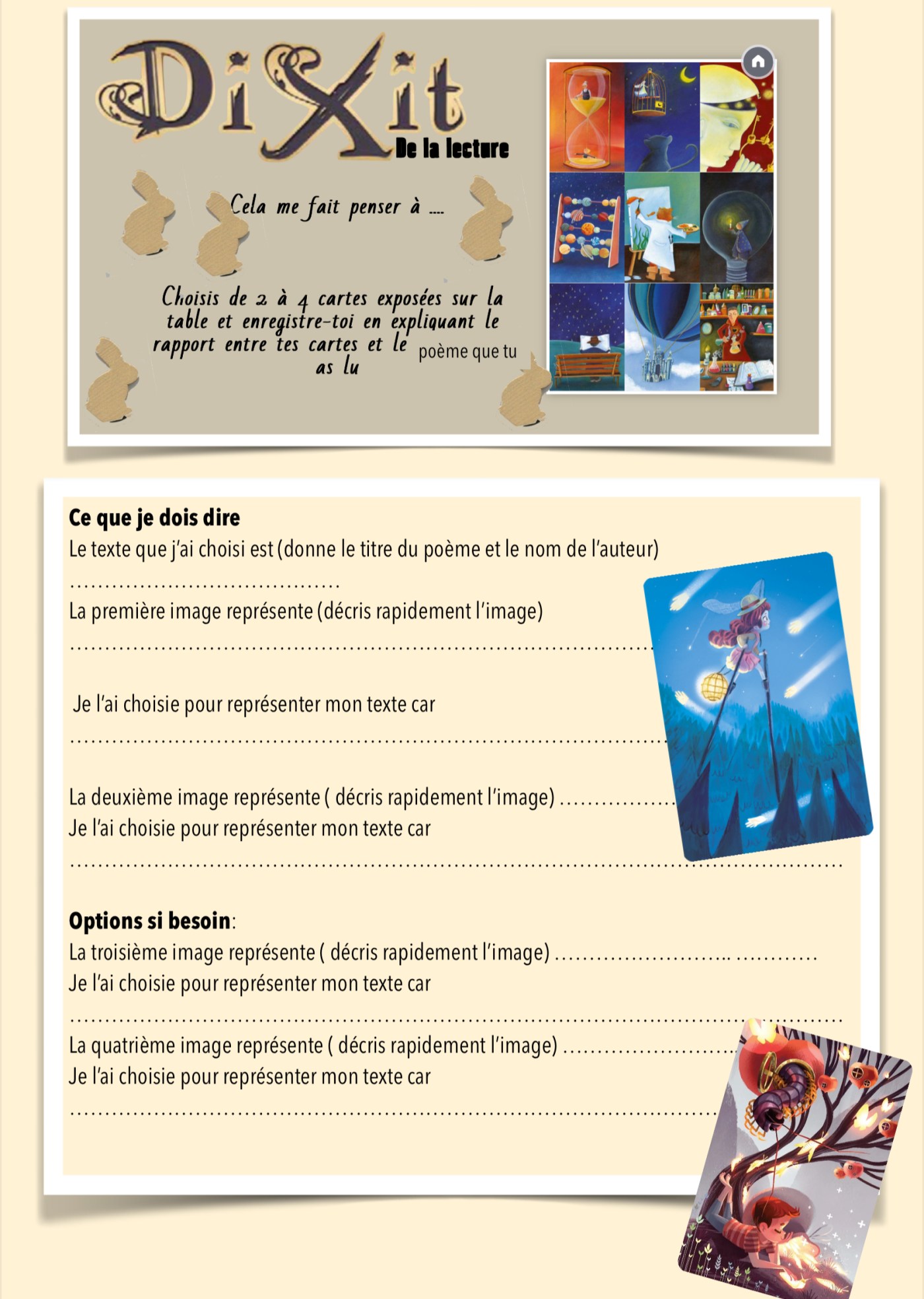 DIXIT: rapprochement images/textes pour s’exprimer oralement En savoir plus sur Le Blog pédagogique de Marie Soulié Abonnez-vous pour recevoir les derniers articles par e-mail. Saisissez votre adresse e-mail… Abonnez-vous Partager : Partager sur X(ouvre dans une nouvelle fenêtre) X Partager sur Facebook(ouvre dans une nouvelle fenêtre) Facebook Envoyer un lien par e-mail à un ami(ouvre dans une nouvelle fenêtre) E-mail Partager sur LinkedIn(ouvre dans une nouvelle fenêtre) LinkedIn Partager sur WhatsApp(ouvre dans une nouvelle fenêtre) WhatsApp Partager sur Bluesky(ouvre dans une nouvelle fenêtre) Bluesky J’aime chargement… Similaire Laisser un commentaire Annuler la réponse. Δ