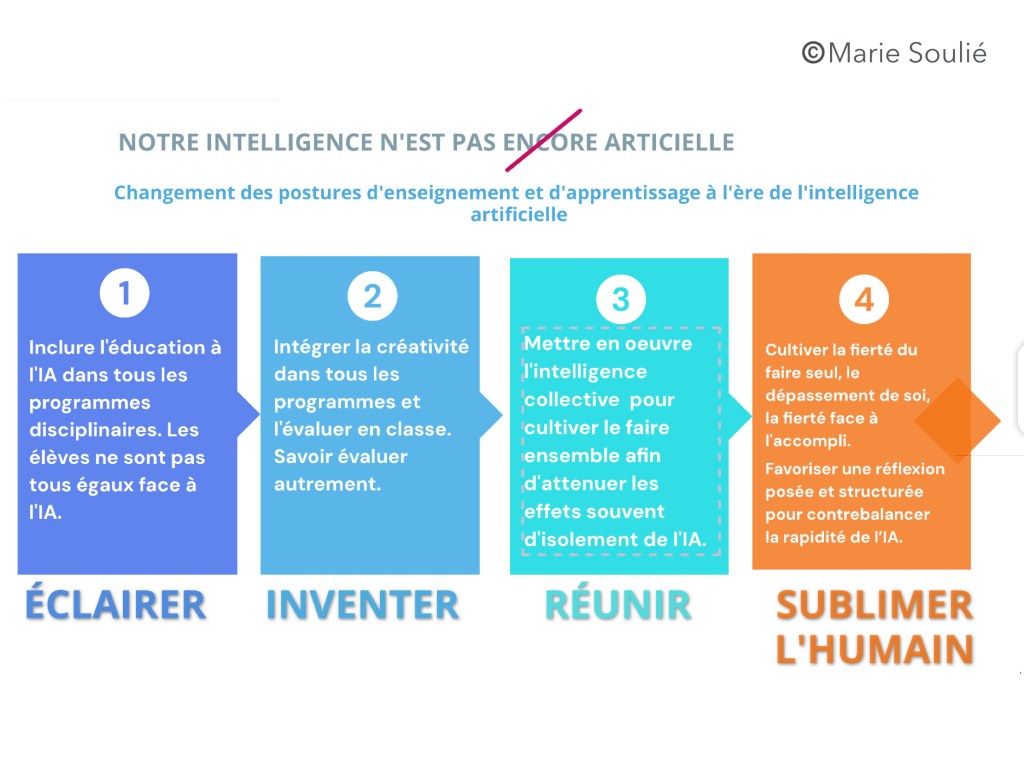 Ma prochaine conférence sera centrée sur le thème Enseigner au XXIᵉ siècle : un changement de posture ? Il est impossible pour moi d’ignorer les impacts de l’IA sur les apprentissages et l’enseignement. Mon objectif ne sera pas de diaboliser l’IA, mais de la considérer comme une opportunité fascinante pour ouvrir de nouvelles perspectives et faire évoluer nos méthodes de transmission, comme cela a toujours été le cas dans l’histoire de l’éducation. Voici une infographie que j’espère suffisamment claire pour illustrer mes propos.