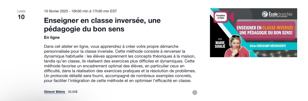 Très fière d’intervenir dans le cadre des #CREACAMP de @ecolebranchee 🇨🇦. Merci pour l’invitation . Inscriptions ici, et un très beau programme https://ecolebranchee.com/calendrier/enseigner-classe-inversee-pedagogie-bon-sens/?