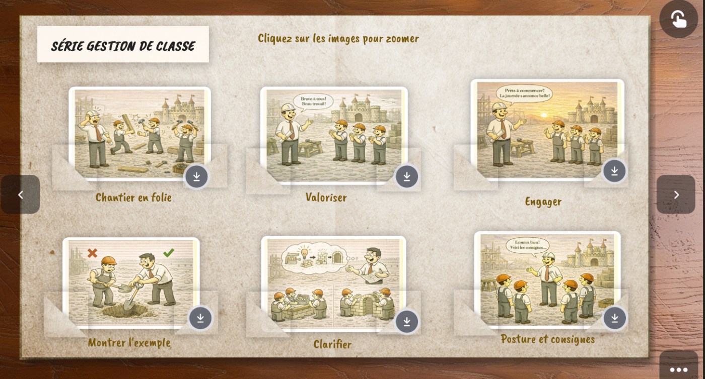 Veuillez retrouver, dans l’album de vignettes illustrant les grands concepts pédagogiques, la série Gérer sa classe.